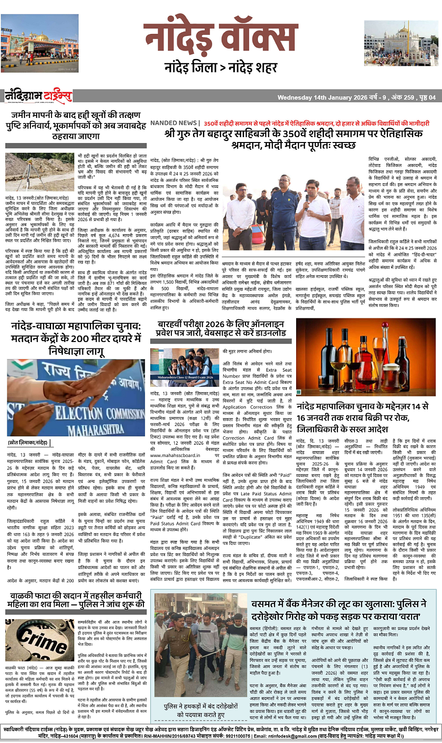 Nandigram Times | Nanded | ePaper | 14 January 2026 Page: 4 January 14, 2026 Nandigram Times ePaper –Nanded – नांदेड, मराठवाड़ा और महाराष्ट्र की ताज़ा खबरें हिंदी में। आज का ई-पेपर पढ़ें, लोकल न्यूज़ और भरोसेमंद रिपोर्टिंग। << First << 1 2 3 4 >> Last >> Page 1Page 2Page 3Page 4 × Nandigram Times | Nanded | ePaper | 14 January 2026 PAGE-1PAGE-2PAGE-3PAGE-4 Full PDF << First << 4 >> Last >> PAGE-1PAGE-2PAGE-3PAGE-4